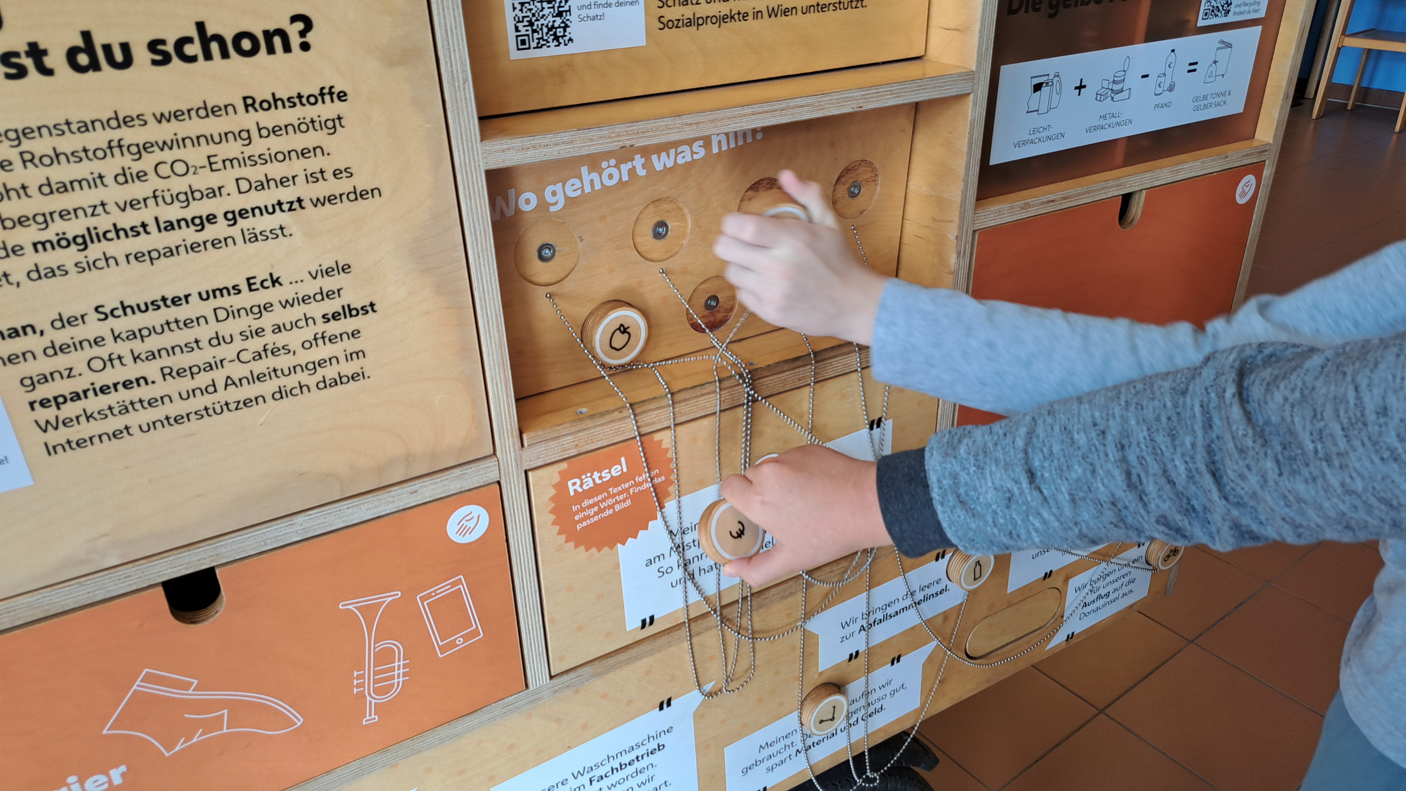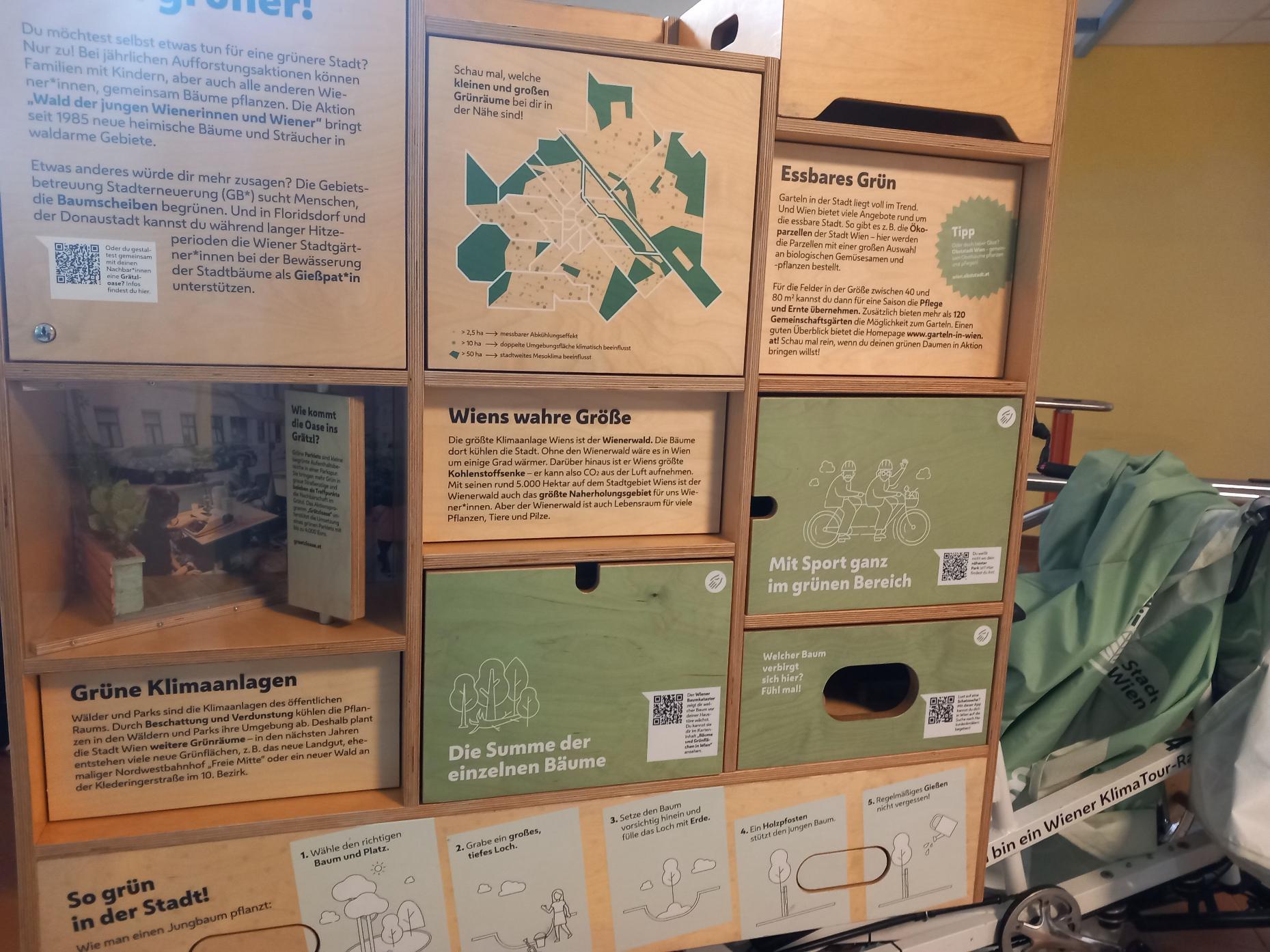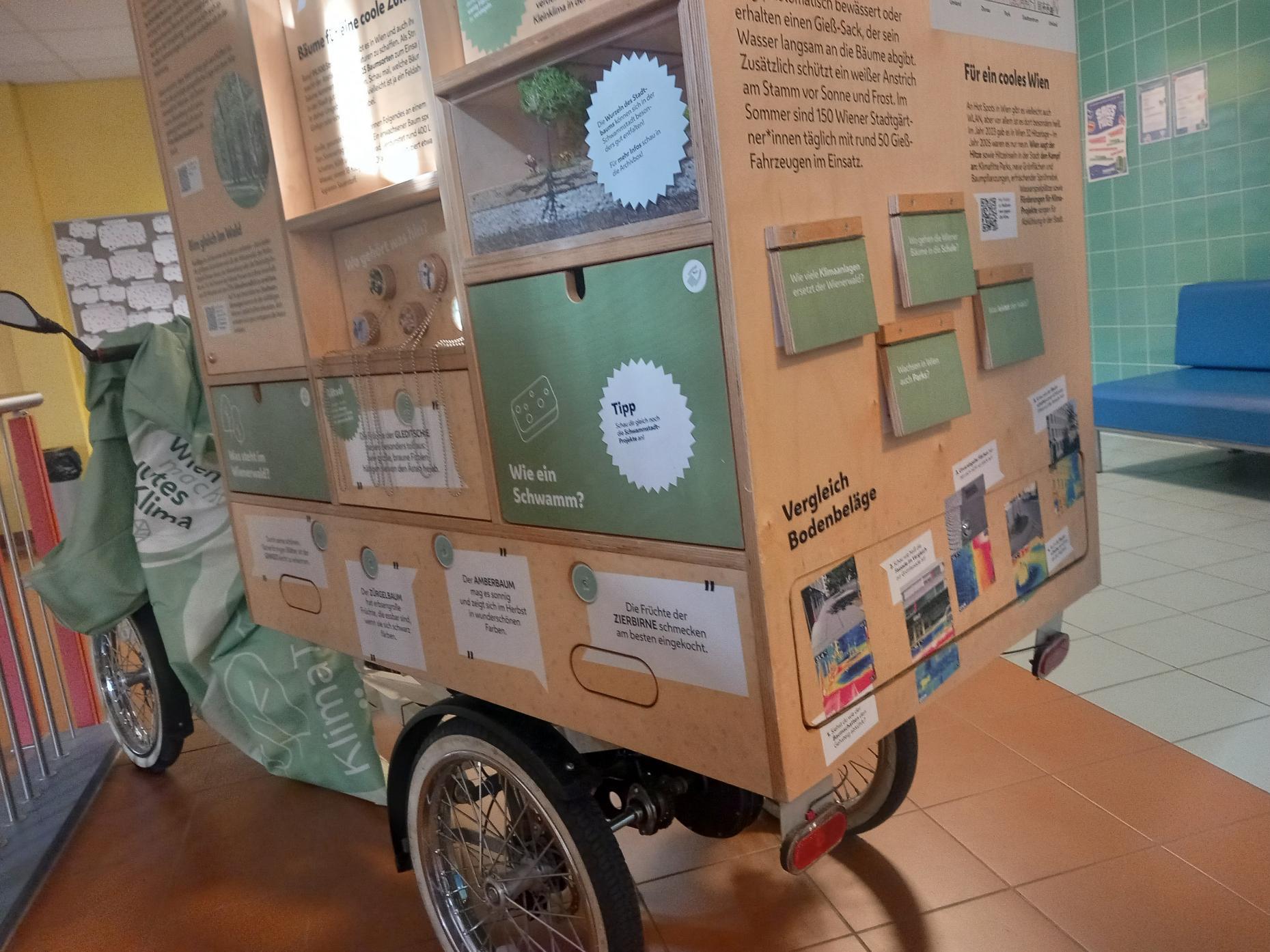 Im Oktober verwandelte sich die Aula unserer Schule in eine lebendige Umwelt-Erlebniszone: Fünf Klimafahrräder – mobile Infostände der Stadt Wien – wurden aufgebaut und von engagierten Umweltkommunikatorinnen betreut. An den Stationen zu Wasser, Müll, Biodiversität, Energie und Klimawandel erhielten die Schülerinnen der Unterstufe spannende Einblicke und lernten in kleinen Gruppen viele neue, interessante Fakten kennen.