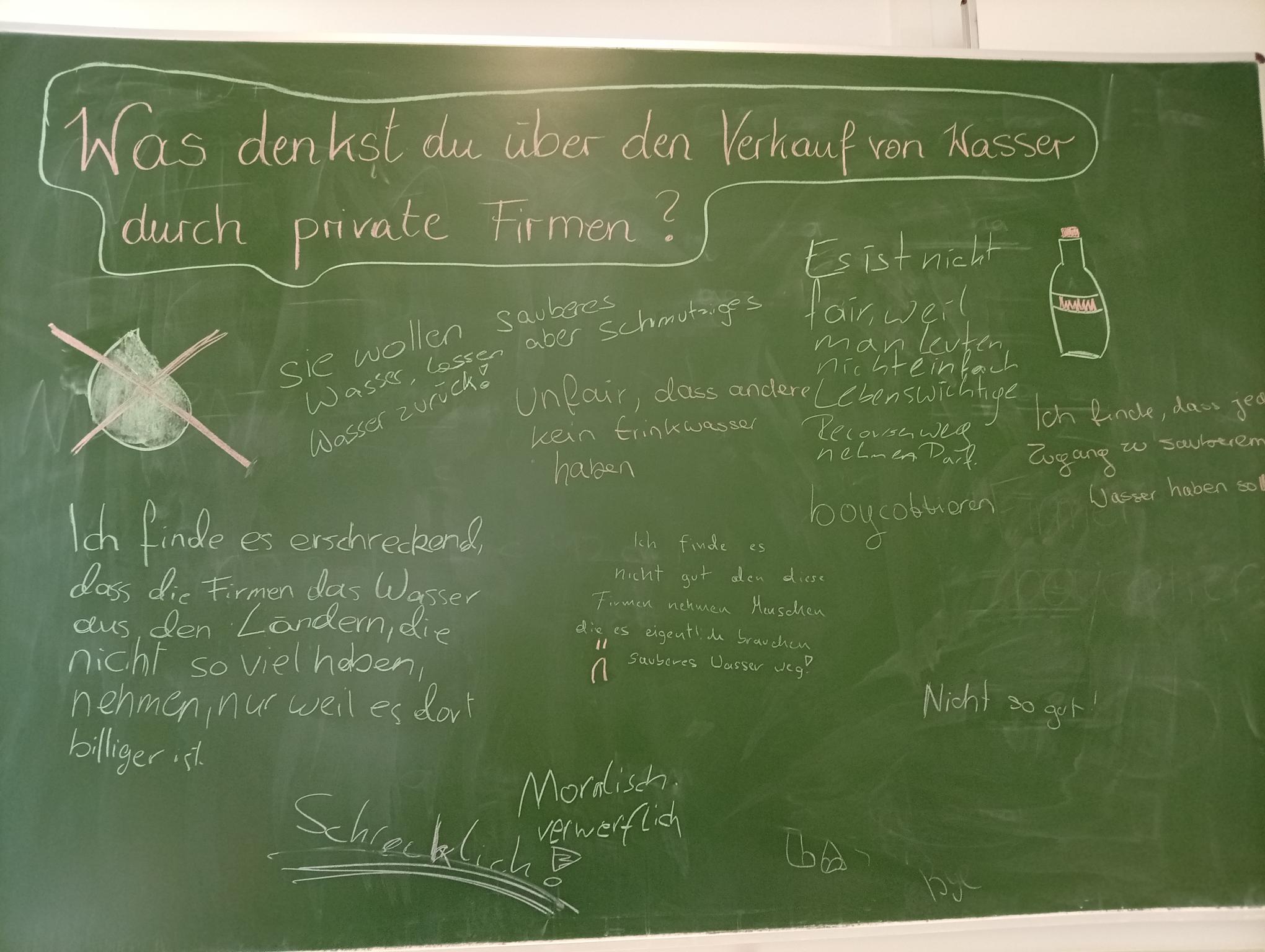 Darüber hinaus beschäftigten sich die Klassen mit gesellschaftlich relevanten Themen wie der Privatisierung von Wasser und dem Menschenrecht auf Zugang zu sauberem Trinkwasser. Die Schülerinnen und Schüler zeigten großes Interesse, beteiligten sich engagiert an einer offenen Diskussion und brachten viele eigene Gedanken ein.