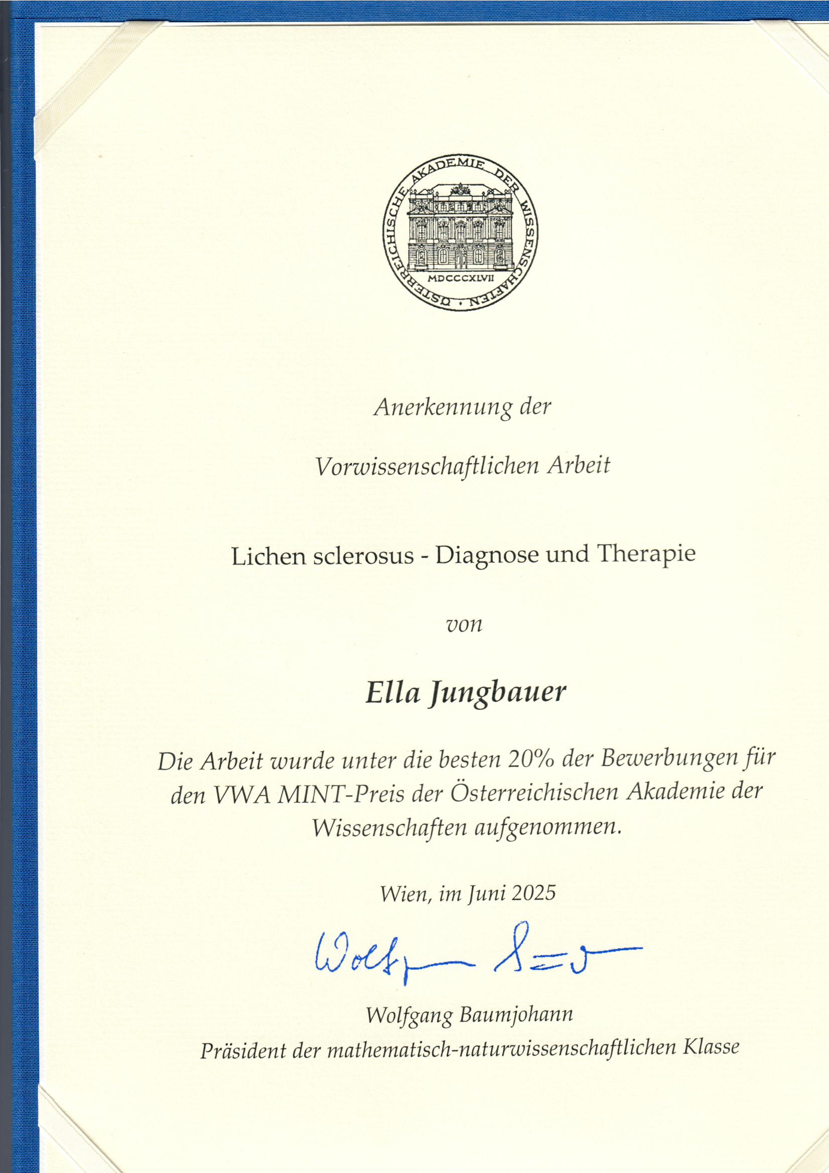 Die Österreichische Akademie der Wissenschaften (ÖAW) würdigte die Abschließende Arbeit (ABA) von Mona Jungbauer mit dem Titel „Lichen sclerosus – Diagnose und Therapie“ für ihre wissenschaftliche Qualität und sorgfältige Aufbereitung. Ihre Arbeit wurde zu den besten 20 % aller eingereichten Arbeiten gezählt und im Rahmen eines feierlichen Aktes ausgezeichnet. Wir gratulieren Mona Jungbauer und ihrer Betreuungslehrkraft Fr. Prof. Klein ganz herzlich zu diesem großartigen Erfolg!