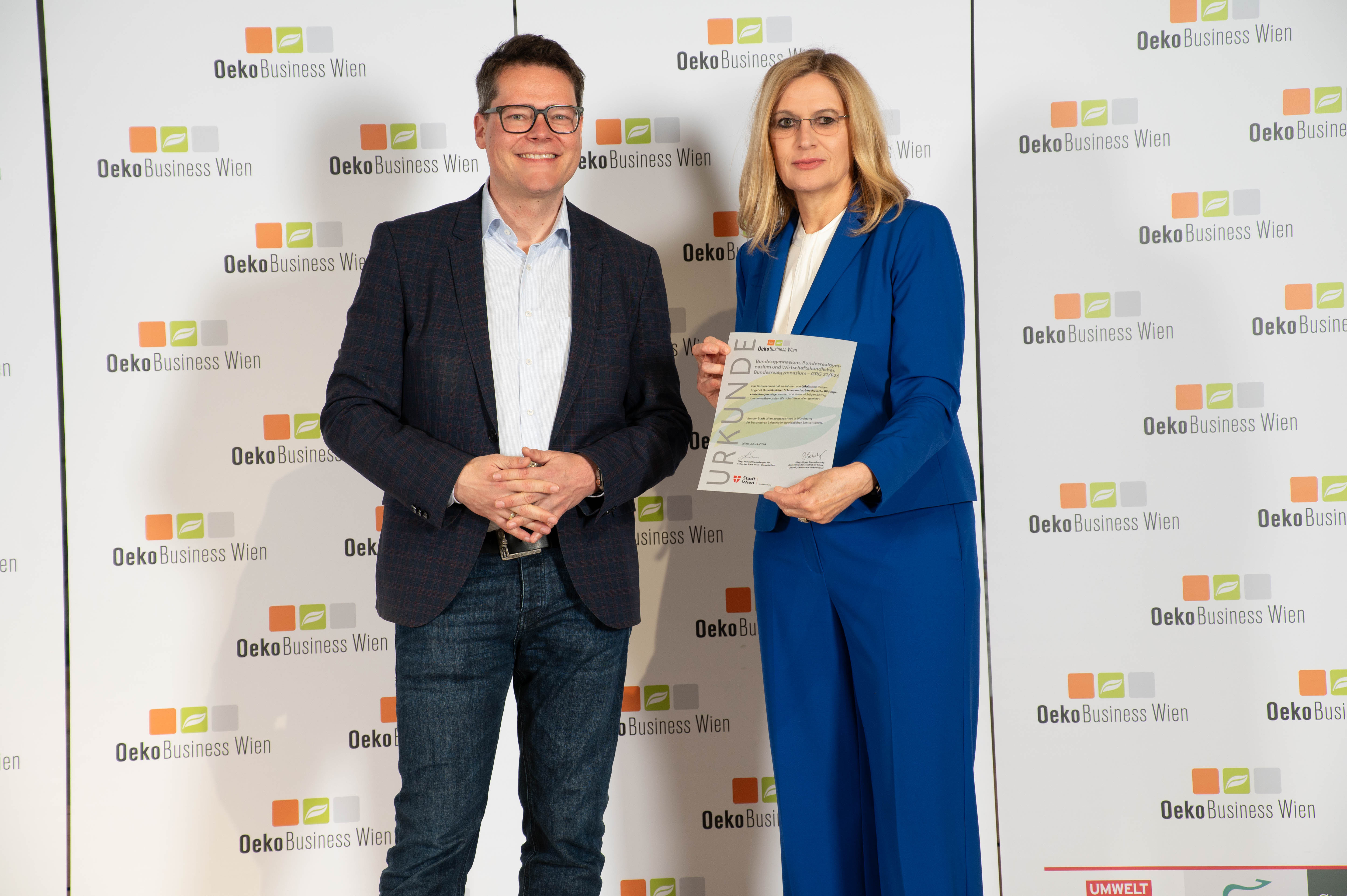 Am 23. April 2024 hatte ich als Schulleiterin der F26 – gemeinsam mit vielen Betrieben aus der Wirtschaft – die Ehre die Urkunde „Öko Business Wien“ entgegennehmen zu dürfen.