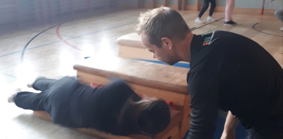 Beide haben also außergewöhnliche und professionelle Erfahrungen in risikoreichen Bewegungs- und Sturzsituationen gesammelt und geben diese mit Humor und viel Engagement an junge Menschen weiter. Die teilnehmenden Klassen trainierten begeistert und alle meisterten am Schluss die technischen Übungen.
