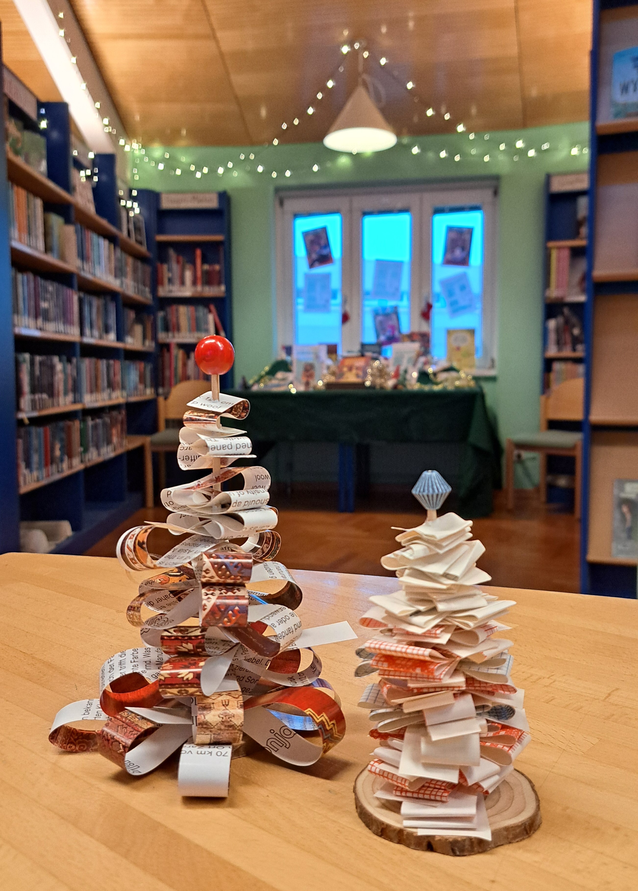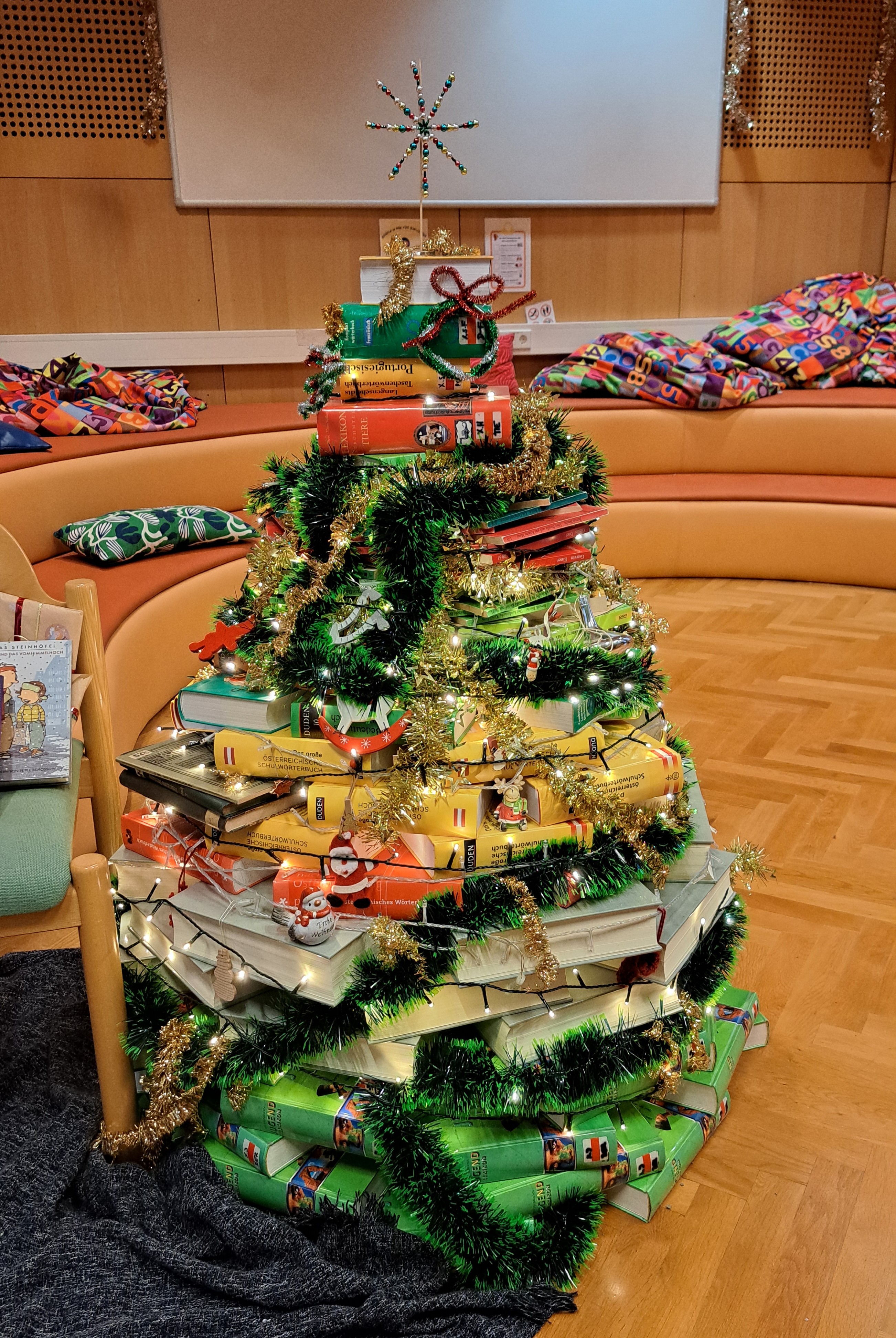 Ein besonderer Blickfang war die Fotobox in einem gigantischen Karton, der als „Geschenkspäckchen“ upgecycelt wurde. Darüber hinaus konnten die Besucherinnen und Besucher selbstgemachten Christbaumschmuck gestalten sowie aus ausgemusterten Büchern dekorative Tannenbäumchen im Sinne des Upcyclings herstellen.