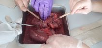 Da wir schon viel über das Herz gelernt haben, konnten wir einige Teile des Herzens sofort erkennen. Danach durften wir das Herz mit dem Skalpell aufschneiden und da war höchste Vorsicht geboten, denn das Skalpell war ein scharfes Messer. Als wir das Herz aufklappeln, sah man die Segelklappen und die Herzkammern viel genauer.
