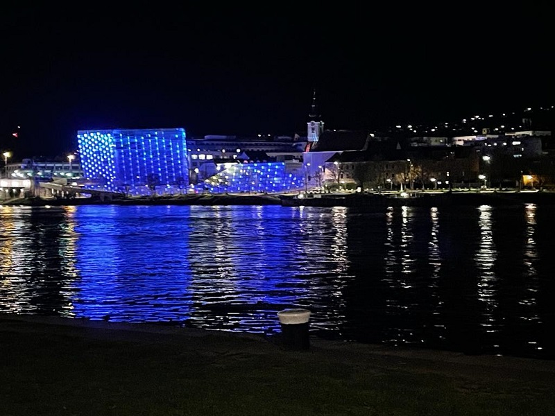 die Lichter an der Donau in Rosa, Blau und Gelb