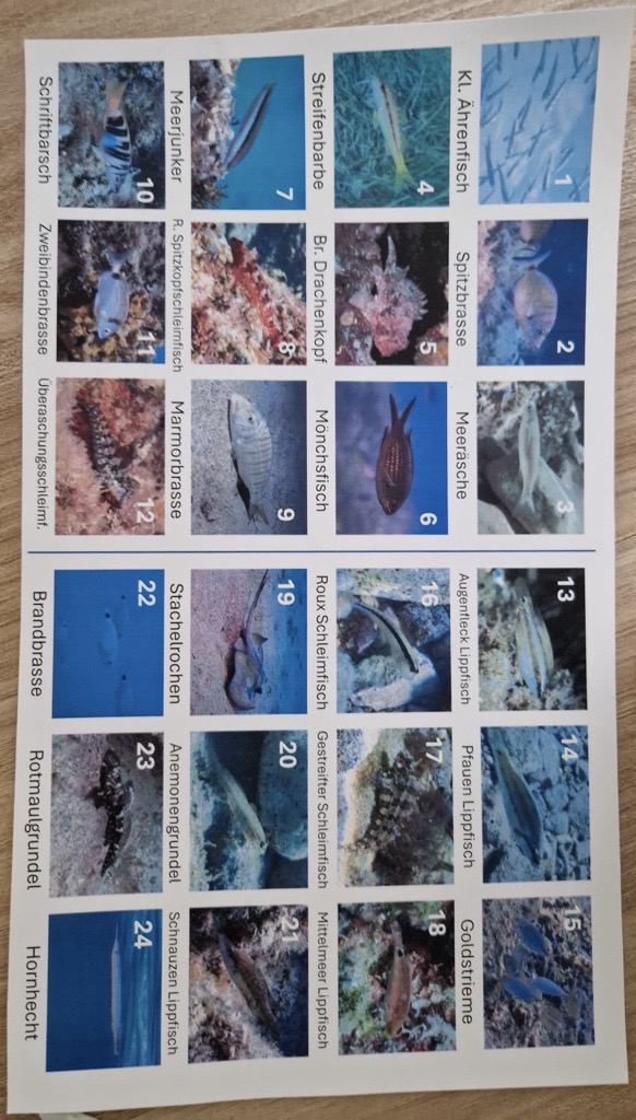 Am nächsten Morgen begann das eigentliche Programm. Um neun Uhr trafen wir uns am vereinbarten Treffpunkt, wo Gerwin uns den detaillierten Tagesablauf erklärte. Anschließend spielten wir das erste Mal das Fischlotto, indem man Pizza gewinnen konnte. Nachdem alle ihre Ausrüstung erhalten hatten, kehrten wir zurück zu unseren Mobilheimen, um uns umzuziehen. Anschließend ging es in Gruppen zum Strand. Dort erhielten wir eine umfassende Einweisung für die Nutzung der Ausrüstung. Ein kurzer Kurs vermittelte uns die wichtigsten Handzeichen und den Umgang mit dem Schnorchel. Als alle gut vorbereitet waren, wagten wir uns ins Wasser – zunächst in Küstennähe zum Üben, später dann weiter hinaus. Nach etwa einer Stunde Schnorcheln legten wir eine wohlverdiente Mittagspause ein, um unsere Energiereserven aufzufüllen. Danach ging es wieder ins Wasser, diesmal selbstbewusster und erfahrener. Der erste ereignisreiche Tag endete mit einem gemeinsamen Abendessen.