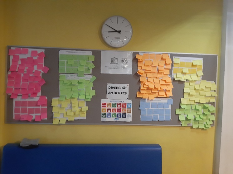 Am 21. und 22. März 2024 fanden an unserer Schule zwei Projekttage für die 5. und 6. Klassen statt, im Rahmen derer sich die Jugendlichen einen Vormittag lang intensiv mit der Frage beschäftigten, wie wir als Schule sowie in weiterer Folge als Gesellschaft mit den unterschiedlichen Formen von Vielfalt in unserem Alltag umgehen sollten und auch, wie wir für weniger Ungleichheiten in diesem Zusammenhang sorgen könnten. Hierfür erstellten die einzelnen Klassen zunächst einen Diversitätsspiegel, indem Post-its zu Reflexionsfragen an der UNESCO-Wand der Schule aufgeklebt wurden.